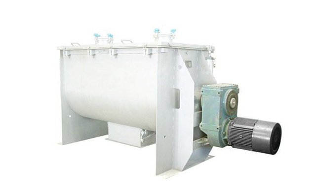 卧式螺带混合机由混合仓、搅拌器、驱动装置基本组成,U型管状仓内安装双层异向螺带盘绕的搅拌器轴,外螺旋带在动力的驱动下,其盘绕形式配合旋转方向把物料从U型仓两端向中央地带推动,而内螺旋带把物料从中间向两端推动,形成对流混合。